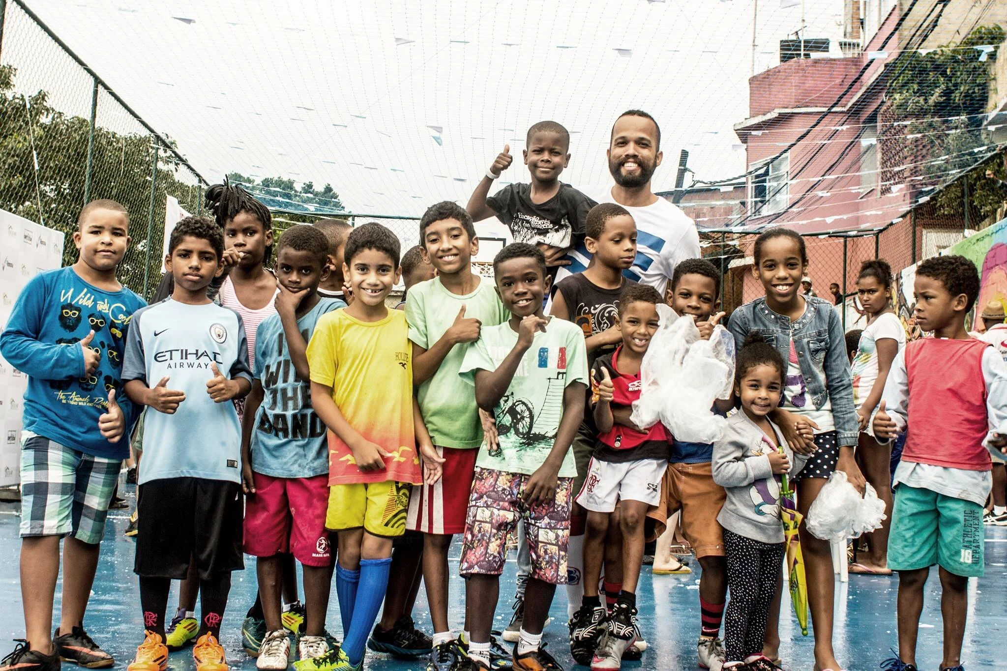 Construido por primera vez por los vecinos hace décadas, la cancha de Cantagalo, hogar de una de las vistas más hermosas de todo Río de Janeiro, fue un importante lugar de encuentro para la comunidad. En 2009, la red protectora alrededor de la cancha fue destruída, dejando el espacio irreconocible desde sus días de gloria cuando jóvenes y viejos jugaban al fútbol durante horas. En el transcurso de seis meses en 2016, Cantagalo se unió para rescatar su cancha y proporcionar un lugar seguro para jugar nuevamente. La cancha ahora tiene una superficie nueva y brillante con una pared circundante, completa con iluminación y redes de protección, ¡una verdadera fiesta para los ojos y los futbolistas que pueden jugar allí una vez más! Más que un lugar para jugar, un jardín en funcionamiento toma forma alrededor del campo, junto con instalaciones de arte de graffiti y puntos de acceso inalámbricos.